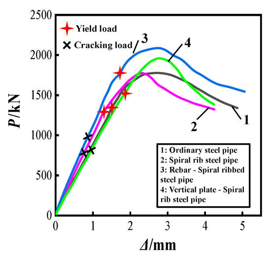 In summary, through the eccentric pressure tests, ordinary thin-walled steel pipe concrete pressure zone significantly bulged, spiral rib-reinforced thin-walled concrete-filled steel tubular laminated component failure modes for the external concrete pressure zone were crushed, tension zones showed transverse cracking, the buckling of thin-walled steel tube with spiral ribs was relatively slight, and the local stability of steel tube was enhanced.