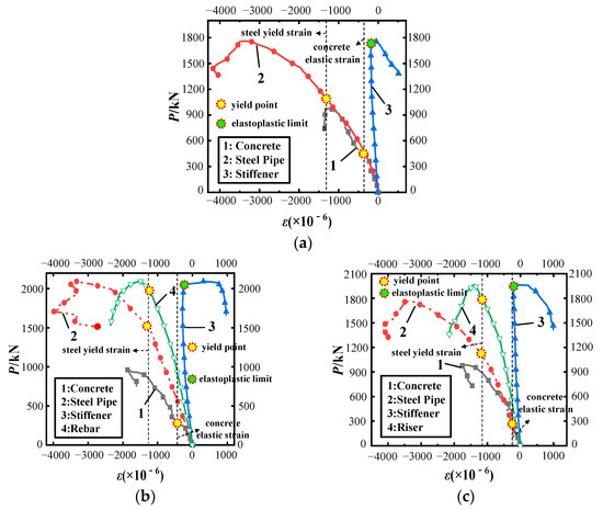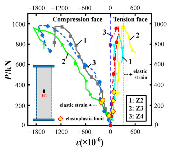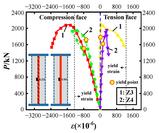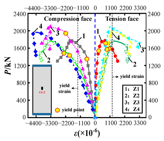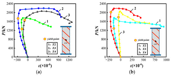 Load–strain relationship curves. (a) Specimen Z2; (b) Specimen Z3; (c) Specimen Z4.
