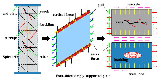 The mechanical behavior of the spiral rib-reinforced concrete-filled thin-walled steel tubular composite column was evaluated. The test eccentricity was 0.4, and the failure mode was still dominated by compressive failure. The external concrete was divided by spiral ribs, forming an oblique strip distribution area. The stirrups and steel bars across a grid limited their cracking and shedding. Finally, under the vertical load, the compression shear failure along the direction of the spiral rib occurred, and the main crack is similar to the angle of the spiral rib. The steel tube was also divided into inclined plate areas by spiral ribs, and the vertical load was decomposed into a pressure perpendicular to the long edge of the thin plate and a shear force parallel to the spiral ribs. The transverse tensile force was decomposed into the pressure perpendicular to the short edge of the thin plate and the parallel shear force. The stress mode is illustrated in Figure 15. Through the analysis, it was found that the thin-walled steel tube is divided into several oblique compression shear zones under the constraint of spiral ribs. Due to the large angle stiffness, the thin-walled steel tube was regularized and simplified as a rectangular thin plate. The boundary conditions were considered simply by being supported on four sides. The force was mainly vertical pressure, and the central part of the thin plate was bulging under compression shear. The stress model lays the foundation for further calculations of the buckling bearing capacity of the thin plate under spiral rib constraint.