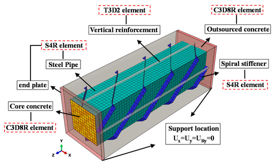 The square steel tube and the spiral rib use a four-node reduced-integration shell element (S4R). This element can automatically select the thin or thick shell theory with the change of shell thickness during the solution. In addition, the Simpson integral of nine critical points is selected on the thickness to ensure the accuracy requirements. The solid element is suitable for an extensive deformation analysis, and the calculation accuracy is high. When the bending deformation of the grid occurs, the analysis accuracy is not significantly affected. Therefore, the loading end plate and concrete are selected to use the three-dimensional solid element (C3D8R) with an eight-node reduction integral scheme. The slenderness of the steel bar is relatively large; its bending, shearing and torsion effects are ignored, and only the tensile force is considered, so the truss element (T3D2) is used.