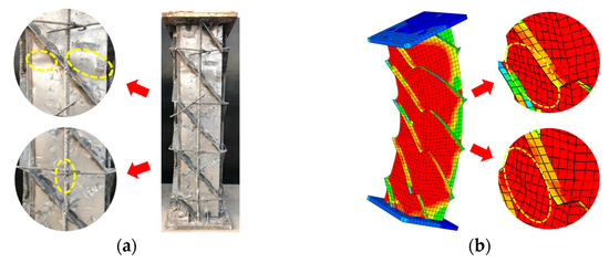When the model is established, each material is non-linear and independent of each other; the steel tube and concrete are surface–surface contacts, and the friction coefficient in the tangential direction is 0.3; normal behavior adopts a hard contact without considering bond–slip between the concrete and the steel tube. The contact relationship between other parts is such that binding constraints are adopted between the steel pipe, the helical rib, and the vertical steel bar. The loads, displacements, and boundary conditions of the finite element model were all consistent with those pertaining to the test specimen (Figure 16).
