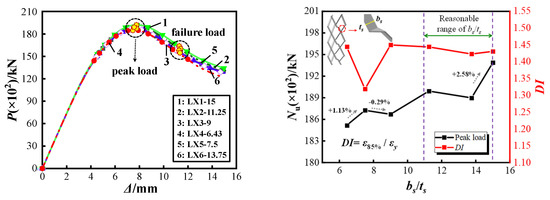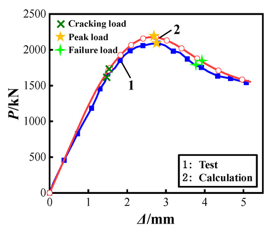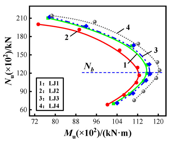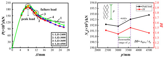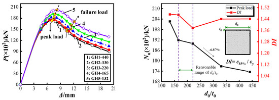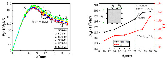 Reinforcing bars and vertical plates are used as external concrete restraining members, and the load–strain curve is shown in Figure 12. Before the specimen reaches the ultimate load, the changes in strain are similar. When the peak load is exceeded, the steel bars can continue to bear load, but the vertical plate loses its effectiveness due to its high stiffness.