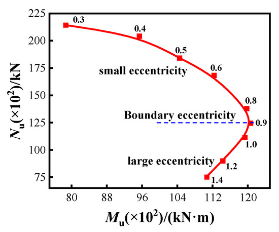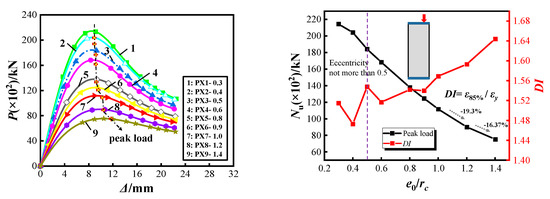 The helical rib load–strain curve is shown in Figure 11. Under eccentric compression, the strain in the spiral rib and its distribution in the compression zone and the tension zone is similar. Before reaching the yield load, the strain in the helical rib is small (about 200 με), and both are under compression. When the member yields, it rapidly transforms into a tensile state, and the strain increases rapidly, reaching about 1000 με, leaving the whole system in an elastic state. This arose because, before yielding, the lateral deformation of the steel pipe is small, and the spiral rib makes little contribution to the vertical load, so the strain therein is small. When the specimen enters the elastic–plastic stage, the core concrete is damaged, the lateral deformation of the steel pipe increases, and the spiral rib laterally constrains the steel pipe and is then under tension. Through the above analysis, it was deduced that: Spirally stiffened ribs act as a space spring-type structure. Their stiffness is small, they do not bear the vertical load, and their role is mainly to enter the elastic–plastic stage of the later transverse deformation of the steel tube and restrain local buckling.