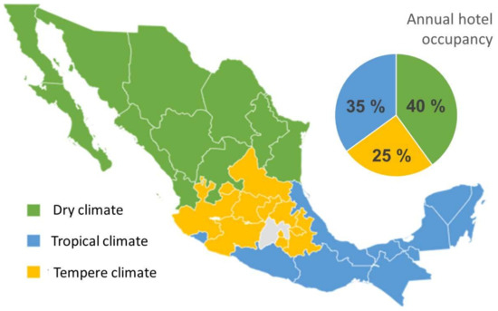 Due to the vast extension of the Mexican territory, the climatic region plays a predominant role from the energy perspective in hotels. CONUEE [3] divides the Mexican territory into three large climatic regions: dry, temperate, and tropical. Figure 1 illustrates the territorial distribution by type of climate of the states that make up the national territory, with the respective occupation percentage. The image indicates that hotels in a tropical climate represented 35% of the hotel occupancy in the country, just below the dry climate. Therefore, two–four star hotels under these climatic conditions are of vital interest from the perspective of energy efficiency due to their tendency to consume more energy.