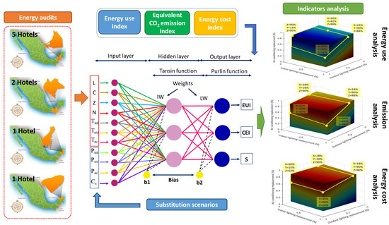 Based on those mentioned above, the novelty of this work lies in being one of the first studies focused on improving the energy performance of Mexican hotels based on the use of indicators. In the same way, it presents an ANN model based on easily measurable characteristics of hotels, which allows one to perform the analysis of potential savings by adopting reduction strategies while remaining competitive. This study is divided as follows: Section 2 presents the general characteristics of the hotels evaluated and the results of the energy audits. Section 3 shows the approach and evaluation of the energy indicators used. The fourth part describes the use of an ANN as a modeling tool. Finally, the fifth part shows the results of the substitution scenarios.