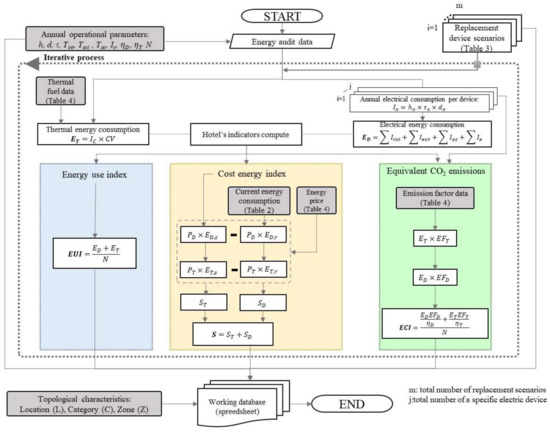 Flow chart of the process for assessing the hotels’ economic, energy, and environmental-performance indicators based on the device-replacement scenarios.