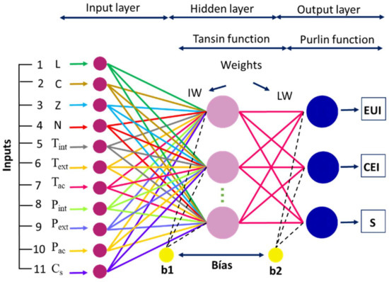 A sensitivity analysis was performed to validate the physical interpretation of the developed ANN model and guarantee its applicability to the case study. This analysis focused on measuring the impact that each of the model inputs produced on the ANN outputs (EUI, CEI, and S). The more significant the effect observed on the output was, the greater sensitivity to the input it presented was. For this purpose, the Garson’s technique [33] was used, which is based on determining said impact from the network interconnection weights: