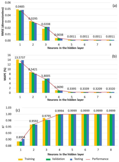 Figure 5 summarizes the analyzed ANN architectures’ statistical performance results (RMSE, MAPE, and R2). As can be seen, the increase in the number of neurons in the hidden layer favored the correlation between the data assigned for training and those estimated by the ANN. Similarly, as the number of hidden neurons increased, the difference between the values calculated by the network and the experimental measurements considerably decreased (Figure 5a,b). In this sense, the trend line present in this figure indicates that after the inclusion of five neurons in the hidden layer, the increase did not significantly contribute to improvements of the estimation capacity. Therefore, the analysis of the statistical performance of the architectures suggested that the reliable results with minor topological complexity were given using five neurons in the hidden layer. This model contained the highest coefficient of determination (R2 = 0.9999), as well as some of the lowest statistical parameters (RMSE = 0.0009 and MAPE = 0.252%) of all the topologies evaluated. In addition, the results corresponding to the validation and testing phases showed that the variation among the three data sets was minimal, which indicated a good generalization capacity of the expert model.