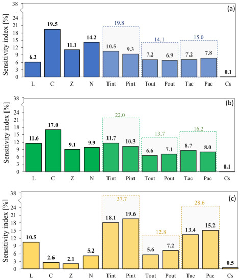 Sensitivity analysis applied to the best ANN model architecture: (a) sensitivity results for the EUI; (b) sensitivity results for the CEI; (c) sensitivity results for S.