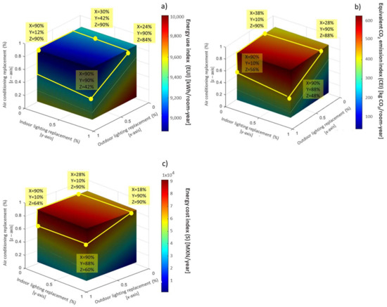 Effects of percentages of technological substitution of indoor lighting, outdoor lighting, and air conditioning on the indicators of interest: (a) energy-use index; (b) equivalent CO2 emissions; (c) energy-cost index.