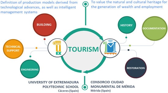 The research team was a multidisciplinary team made up of experts in the fields of cultural heritage, with its management and dissemination being their main activities. This team has very advanced technical profiles. From the University of Extremadura, there are architects with expertise in the fields of tourism and heritage, civil engineers with experience in surveying and BIM technology, and advanced technical support including a physical engineer who could perform particular technical tasks and data collection in situ that require this experience and expertise. In partnership, the Consorcio of Mérida provides the archaeologists and restorers, who provide the project with all of the necessary information on the archaeological studies and the conservation state of the monuments.