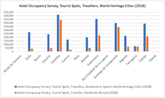 With these data, we realised that the number of overnight stays in the city has increased, which means that Mérida receives more tourists who travel specifically to visit the city, reducing the number of “passing through tourists”. Of all the tourists that the city received in 2018 (287,208 people), 23% (65,161 people) were foreigners. These data from the study carried out in Mérida have been put into context with other World Heritage Cities in Spain, for which we carried out a comparative analysis between the different cities in order to contextualise the data within the tourism panorama on a national level. This comparative analysis was carried out on the basis of data provided by the National Statistics Institute (INEN) (Figure 3).