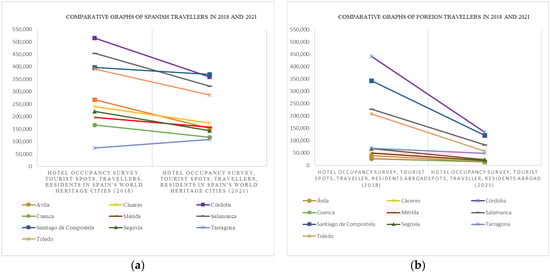 Another analysis carried out was to observe what impact the COVID-19 pandemic has had on tourism in Spain’s World Heritage Cities. In the following graphs, we can see a comparison of the number of tourists received by the cities before and after the pandemic (2018 and 2021) (Figure 4).