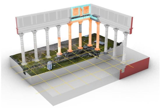 Based on all of the data collected, both from the survey and from the archaeological reports, a virtual model was created with all of the information []. It should be kept in mind that in the process of making the model, the presence of archaeologists is essential in order to verify each of the reconstructed elements at all times. A colour code was created to indicate which parts are original and have been preserved on site, which are original and have been moved to their original location (anastylosis), which parts have been materially reconstructed, and which have been virtually reconstructed (these parts will also have a lower level of detail) (Figure 10). At this point, the work of the archaeologists, who will carry out studies of the walls and extrapolate the information from the excavation reports to the models, is fundamental.
