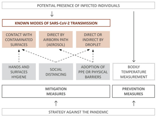 Although not directly related to the known modes of transmission of the virus, temperature scanning represents another largely implemented measure. Since the beginning of the pandemic, individuals have been implored not to leave home in case of an alteration of body temperature, as it could be a symptom of infection. However, they do not always perform this self-monitoring, especially if they do not sense any change in their health. In this sense, body temperature scanning can be considered a prevention measure, as illustrated in Figure 2. Therefore, hand and surface sanitizing, social distancing, and use of face masks—due to their individual inability to fully avoid the contagion—can be considered “mitigation” measures rather than prevention ones.