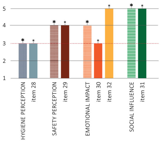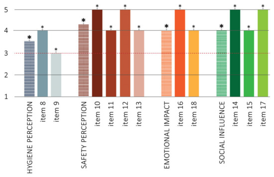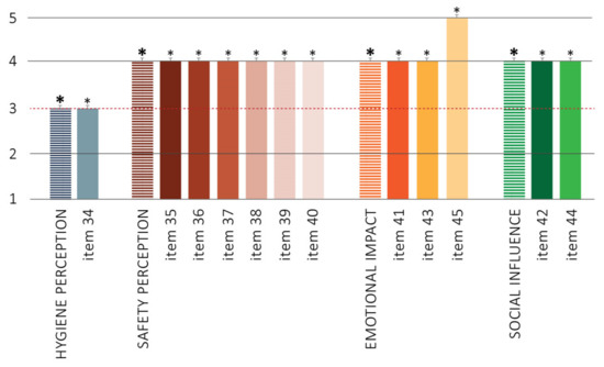 The data collection was agreed upon by the supervisor of each building, activity, or business, who granted his/her consent. The researchers conducted a site inspection in each facility to identify and classify the implemented measures at the entrance(s) and indoor. Then, they involved the users at the buildings’ exit(s) during opening hours for several weeks. Users were asked to fill out a self-report questionnaire accessed through a tablet (sanitized after each usage by the researcher) and a QR code. The instrument was specifically structured for the research to investigate the users’ opinions and preferences about the anti-COVID measures adopted in that specific building, activity, or business. The questionnaire was realized and administered through the Qualtrics software. The participation was anonymous and voluntary; full information about the research was displayed before compiling, and consent to the use of personal data was requested. The questionnaire was structured in five sections. The first section concerned social and demographic topics and information about the individuals’ habits during the pandemic and their personal experiences. The second section was conceived to explore the frequentation of the site and the perception of users about the presence/absence of the anti-COVID measures implemented in that building, activity, or business, with a specific focus on hand-sanitizing solutions, temperature-scanning instruments, signage/wayfinding system, and “green pass” (the Italian informal name used to identify a certificate providing proof of a complete course of vaccination against COVID-19) control. The third section focused on the users’ opinions, assessed through their agreement to several questions, expressed on a 5-point Likert scale (1 = I completely disagree; 2 = I partially disagree; 3 = I am neither in agreement nor in disagreement; 4 = I partially agree; 5 = I completely agree). The NA option (not applicable) was added in those cases where it was impossible to provide the degree of agreement (e.g., the investigated anti-COVID measure was not implemented in that case study). The items concerned the overall implementation of anti-COVID measures, the specifically used devices, and wayfinding, considering eight dimensions. The dimension of clarity of information and arrangement of the devices (3 items) investigated if the user considered the implemented measures clear and well-organized [36]. The usability dimension (3 items) investigated if the individual found the functioning of the hand-sanitizing dispenser [37] and the temperature measurement at the entrance [38] simple and efficient. The perceived utility dimension (3 items) evaluated how much the individual found the anti-COVID measures adopted by the facility useful to limit the COVID-19 pandemic and to protect both their health and that of the community [37,39,40]. The perceived safety dimension (3 items) investigated whether shared internal public spaces were perceived as safer in the presence of anti-COVID devices. Furthermore, it assessed the perception of other people’s compliance with anti-COVID measures [33,41]. The perception of hygiene and healthy spaces dimension (3 items) investigated the perception of people about the hygiene of the facility and the tidiness of the anti-COVID devices present in the structure [32,42,43]. The social influence dimension (3 items) assessed the user’s emotional reactions concerning the social context and therefore to the other users and the staff within the structure [44,45]. The hand-sanitizer dispenser appreciation dimension (4 items) investigated the individual’s satisfaction concerning the dispenser’s material, shape, and aesthetics [40]. Finally, the wayfinding dimension (4 items) explored the clarity and ease of understanding of vertical and horizontal routes-management signage. It also verified the ease of identifying entry and exit routes [20,43]. Table 6 and Table 7 detail the investigated items and the related dimensions.