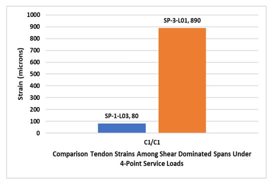 - Under two and four-point service loads, higher tendon strains were usually recorded in specimen SP-3 than those recorded at corresponding locations in specimen SP-1. A similar comparison under similar load levels revealed comparable tendon strains in specimens SP-1 and SP-2.