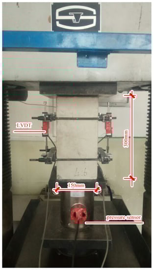 Then, the concrete prism sample was tested with a closed-loop servo-controlled compression testing machine with a capacity of 200 kN. The compressive load was applied in displacement-control mode. The sample’s load and deformation were measured by a pressure sensor and linear variable differential transformer (LVDT).