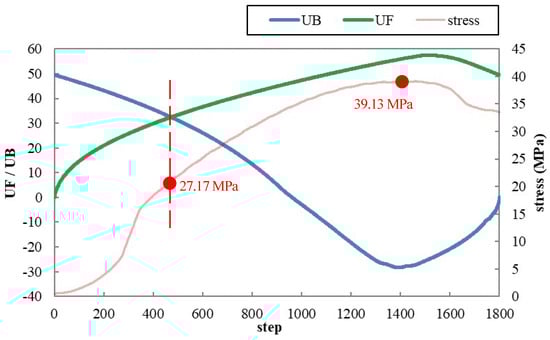 Next, the time of the abrupt and sudden change occurrence is discussed. As mentioned above, the or value exceeding the threshold demonstrated a remarkable trend, which could be considered an abrupt and sudden change. The UF value exceeded the threshold at the very beginning of the loading stage, which also demonstrated that a monotonic gradually increasing compressive loading would cause the sample’s inevitable failure. Meanwhile, the intersection of the curves of UF and UB was located in the elastic stage, when the stress reached about 21 MPa. This intersection location indicated that the possible significance of the change occurred when the stress reached about of the compressive strength, 39 MPa. In other words, if the concrete prism sample was subjected to a monotonic compressive loading, the possible significance of stress change might take place when about of the maximum load was imposed.