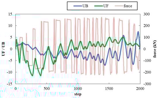 The resultant force series obtained essentially represented the reinforced concrete block masonry shear wall’s mechanical response under cyclic loading. According to the analysis results represented in Figure 3, the following aspects can be highlighted:
