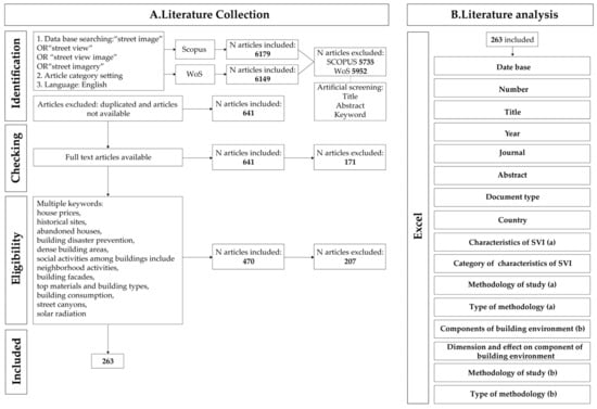 The second step was to retrieve articles from the databases. Relevant topic papers were selected from journals using search terms in two academic databases (Figure 1). The first screening phase was performed by searching for titles, abstracts, authors, and keywords. Then, we excluded articles that were not available in full-text form as a second check. Multiple keywords were used to conduct a third eligibility check to capture the different trending items in building environment research, such as house prices, historical sites, and neighbourhood activities. Finally, the acquired literature was analysed based on the content, methodology, and year, among other factors (Figure 1). Since Google Maps first launched SVI in 2007, this paper captured the academic literature on the use of panoramic street images for urban built environment research published from 1 January 2007 to 7 April 2022, a span of fifteen years. Figure 1 shows the whole process of review in detail, and 263 related pieces of literature (n = 263) were ultimately obtained.