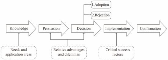 The articles’ contents are identified and categorised in the second stage. The Rogers innovation–decision process [] was used as the formal conceptual framework to categorise the articles (Figure 2), which helps to systematically grasp the application of SVI in the built environment, including in relation to feasibility and research fields. The innovation–decision process includes the time frame from the first awareness of the innovation to its adoption or rejection by the potential adopters. This model is based on many empirical studies and contains a set of research methods, data collection approaches, and analytical models; it can be applied to studies on the diffusion of innovation and it is predictable []. The innovation–decision process facilitates a systematic grasp of the application of SVI in the built environment, integrates the strengths and hindrances of researchers in the specific use case, and evaluates the use of SVI in the built environment. The knowledge stage includes streetscape technology sources, requirements, and applications. At the persuasion stage, the benefits and dilemmas of panoramic images are analysed to obtain a better understanding and perspective. The decision stage occurs mainly to adopt or refuse the innovative actions caused by SVI. At the implementation stage, SVI is deployed and used in the built environment.