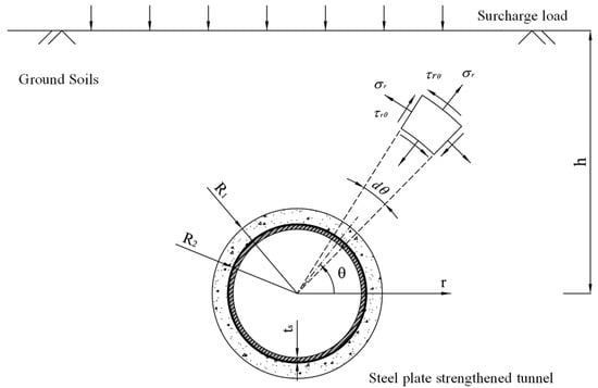 where and are concrete lining displacement in the radial and circumferential directions, is the elastic modulus of the concrete lining, is the Poisson’s ratio of the concrete lining, and , , , , and are constants to be solved according to the boundary conditions. The boundaries of the concrete tunnel lining at r = R2 and r = R3 are considered, where the concrete lining is subjected to the interaction stresses from the ground and the steel plate, respectively. The stress components of the concrete lining at r = R1 are given by: