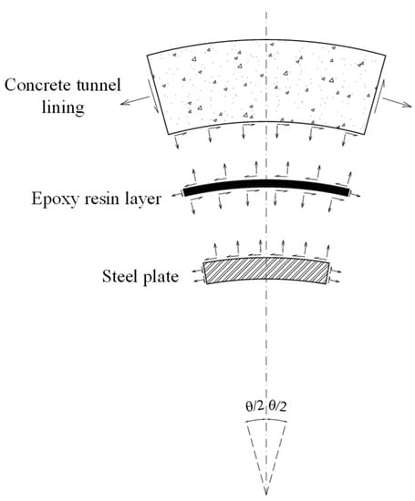 Abundant research has been conducted into analytical solutions for determining the stress and displacement fields associated with circular tunnel linings using the stress function method. Wood [13] and Morgan [14] proposed a method to calculate the internal forces of buried circular tunnel lining with an elliptical deformation mode. Einstein and Schwartz [15] presented a simplified analytical solution for a general circular tunnel, which was expanded by Bobet [16] to calculate tunnels under saturated ground conditions. Based on a similar methodology, much research has been conducted to predict the ground movement patterns due to the existence of tunnel linings [17,18,19]. Soil plasticity is also considered in many other ground movement prediction models [20,21]. There are some studies on analytical solutions for tunnels with double linings. Mason and Abelman [22] studied a two liners system circular tunnel, which was subjected to shear stress at infinity. El Naggar et al. [23,24] presented a closed-form analytical solution for a composite lining of a circular tunnel in deep burial conditions, where the stress and displacement results of double-layered circular tunnel lining were presented based on the theory of thick-wall cylinders. In the previous theoretical analysis for composite tunnel linings based on the theory of thick-walled cylinders, the interface between separate liners could only be considered as ideal scenarios, namely full-slip and no-slip [25]. In terms of the full-slip condition, the outer and inner linings are assumed to be frictionless; thus, relative displacement between two liners could happen without restriction along the interface. In terms of the no-slip condition, the outer and inner linings are assumed to be perfectly connected, thus no relative displacement would occur. Although it is sometimes reasonable to simplify the interface as full-slip or no-slip scenarios, the actual interface behavior is always somewhere between these two ideal conditions. For the steel strengthened tunnel problem discussed in this paper, the steel plate is bonded to the concrete lining by a layer of epoxy adhesive. The interface slippage between the tunnel lining and steel plate will happen at the adhesive when they deform as a composite lining system. However, the existing analytical solutions based on the theory of thick-walled cylinders are not able to well capture the interface slippage between the tunnel lining and steel plate because the interaction mechanism is only considered as either no-slip or full-slip scenarios.