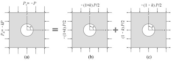 As shown in Figure 4a, the ground soil with a circular tunnel excavation is subjected to far field stress Pv = −P and Ph = −kP, where P is the surcharge load and k is the earth pressure coefficient. It is considered equivalent to the superposition of a hydrostatic condition and a deviatoric condition, as shown in Figure 4b,c, respectively.
