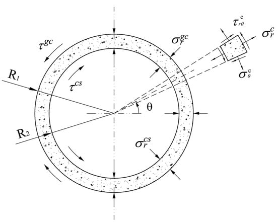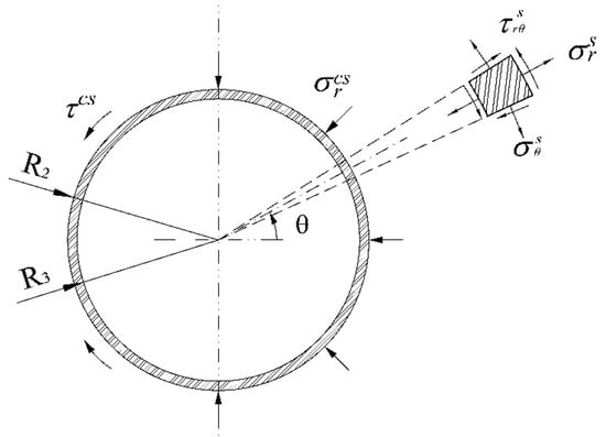 where and are steel plate displacement in radial and circumferential directions, is the elastic modulus of the steel plate, is the Poisson’s ratio of the steel plate, and , , , , , and are the constants to be solved according to the boundary conditions. Boundaries of the steel plate at r = R2 and r = R3 are considered. The steel plate is subjected to the interaction stress from the concrete lining at r = R2, where the stress components are given by: