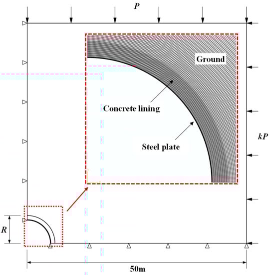 To validate the rationale and accuracy of the proposed analytical solutions, a finite element (FE) analysis was conducted to simulate the circular tunnel strengthened by a steel plate. The analysis was executed using the commercial FE package ABAUQS. To simultaneously achieve a good calculation accuracy and a high computational efficiency for such a symmetric problem, a quarter plane model is adopted, the mesh of which is shown in Figure 7. It contains three components, the ground, a tunnel lining, and a steel plate with 20576 four-node plane strain (CPE4) elements in total. All the materials are taken as elastic, and the parameters listed in Table 1 are adopted. The left vertical boundary of the ground is fixed in the X direction, while the bottom boundary is fixed in the Y direction. The width and the height of the half ground model are 50 m which is over 10 R, so the effect of the boundary could be neglected. The ground stress caused by the surcharge load is simulated by applying vertical load P on the top and horizontal load on the right.