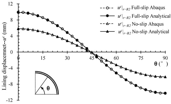 Figure 8 presents the comparison of the lining displacement evaluated by the Abaqus FE model and the analytical model proposed in this study. The tunnel deformations calculated by the two models agree well with each other in both full-slip and no-slip interface conditions. The tunnel deforms elliptically, with the lining inward motion occurring at the tunnel crown and outward motion occurring at the tunnel spring line. The maximum lining displacements calculated by the analytical and the FE model are −10.25 mm and −10.30 mm at the tunnel crown (θ = 90°), respectively. The largest difference in lining displacement given by the Abaqus FE model and the proposed analytical solution is 0.5%.