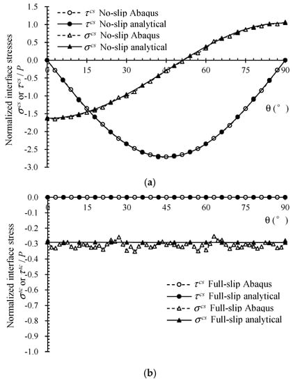 Figure 9 compares interface stresses evaluated by FE and the proposed analytical solutions. Figure 9a shows results from the steel plate strengthened tunnel with the no-slip concrete-steel interface. It was observed that the interface normal and shear stress evaluated by the two models agree well with each other. The interface normal stress between the concrete lining and steel plate is compression from 0° to 51°, while it is tension from 51° to 90°. The maximum interface tension and compression stress appear at the location of the tunnel spring line (θ = 0°) and crown (θ = 90°), respectively. The largest difference in the interface normal stress evaluated by the analytical and FE method is 2%. The maximum interface shear stress appears at θ = 45°, where the difference in the shear stress values evaluated by the two methods is 0.08%.