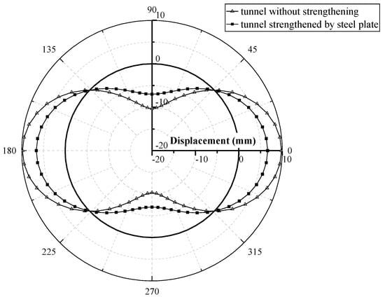 Comparison of lining radial displacement between tunnels with and without steel plate strengthening.