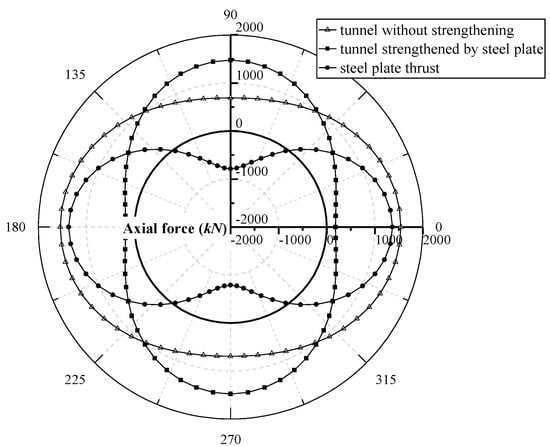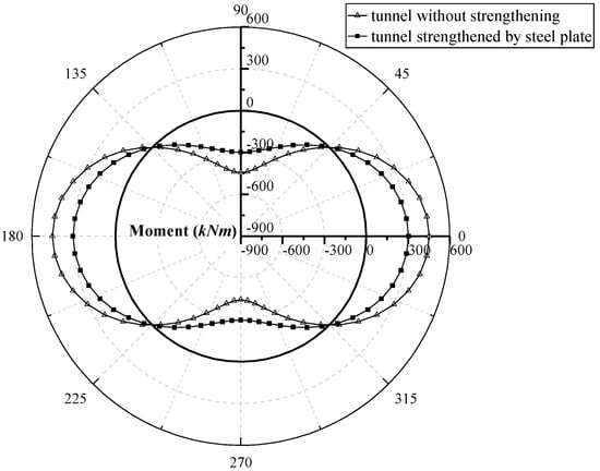 In order to better understand the change of lining forces due to the steel plate strengthening, the moment and axial force within the concrete lining or the steel plate are extracted for comparison. As shown in Figure 11, the lining moment of tunnels with and without steel plate strengthening are compared. The moment value is treated as positive when tensile stress appears at the outer edge and compression stress appears at the inner edge of the concrete tunnel lining. The lining moment of the tunnel without strengthening is 451.6 kNm at the tunnel crown and −444.3 kNm at the tunnel spring lining. The peak lining moment of the strengthened tunnel is 303.1 kNm at the tunnel crown and −297.9 kNm at the tunnel spring line. The lining moment has been minimized by 32.9% due to the steel plate strengthening.