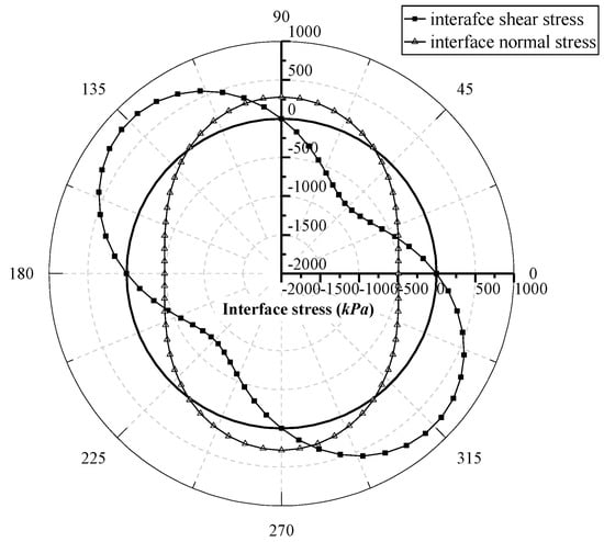 In terms of the interface shear stress, the direction is clockwise in the range from 0°~90° and anticlockwise in the range form 90°~180°. The maximum interface shear stress is 781.5 kPa, which appears at the positions of θ = 45°, 135°, 225°, and 315°. Therefore, the interface shear strength at these positions must be guaranteed during the construction of the steel plate strengthening.