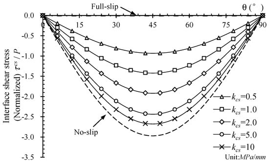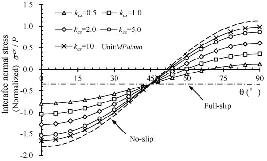 The influence of the interface shear stiffness on the normal and shear stress between the concrete lining and the steel plate are shown in Figure 14 and Figure 15, respectively. Normalized interface stresses in both normal and tangential directions, namely and , are extracted along the tunnel-steel interface from θ = 0° to 90°. It is observed that values of the interface shear and normal stress increased significantly, as kcs increased from 0.2 to 10 MPa/mm. In terms of the no-slip mode, the maximum compressive stress with normalized value of −1.82 and the maximum tensile stress with a normalized value of 1.17 is observed at the positions of the tunnel spring-line and crown, respectively. The maximum shear stress with a normalized value of −3.05 is observed at the position θ = 45°, while the shear stresses vanish at positions of the tunnel spring-line and crown. In terms of the full-slip mode, constant stress with a normalized value of −0.33 in the normal direction and zero in the tangential direction are observed along the interface. This indicates that in the full slip condition, no shear resistance exits at the tunnel-steel interface. The steel plate could only provide a very small effect against the uniform constriction deformation.
