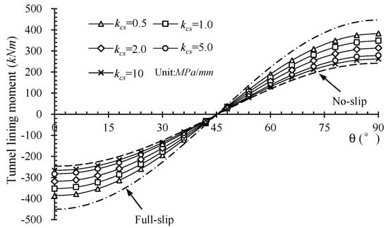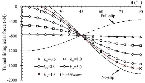 In addition, as the value of kcs increased, the patterns of the interface stress distribution were evaluated in the case of full-slip conditions towards that of the no-slip interface condition. The interface normal stress close to the tunnel crown changed from compression to tension, while the compression stress close to the tunnel spring lining kept increasing. When the value of kcs is relatively large, it indicates that the situation that the adhesive works well and the steel plate is perfectly bonded to the concrete tunnel lining. The effectiveness of steel plate strengthening is at its best performance, and the two components behave in terms of a composite lining system. When the value of kcs decreases to a relatively small value, it indicates that the bonding adhesive gradually loses function, and the tunnel lining and the steel plate work separately with only small compressive interaction between the two components.