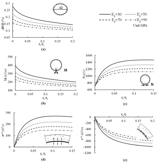 The thickness of the steel plate is one of the most important design parameters that determine the cost and effectiveness of the tunnel strengthening projects. The purpose of this section is to provide an integrated understanding of the influence of the steel plate thickness, which is hoped to contribute to a better application of this tunnel strengthening method. The influence of steel plate thickness on the strengthened tunnel lining performance is analyzed under different conditions of soil elastic modulus using the proposed analytical solutions. The results are shown in Figure 18.