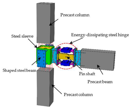 Industrialization of the construction industry promotes the development of precast reinforced concrete structures, which have entered the rapid growth stage. Precast reinforced concrete structures can improve construction quality, construction efficiency, and economic benefit, which are conducive to environmental protection [1,2]. However, the mechanical properties of the connection area of the prefabricated members always affect the integrity and seismic performance of the fabricated structure, which is more likely to be damaged and result in the collapse of the whole structure under the action of earthquakes [3,4]. Therefore, the research and development of new beam–column connections with the required mechanical properties is of great significance to improve the seismic performance of prefabricated concrete structures [5,6,7,8].