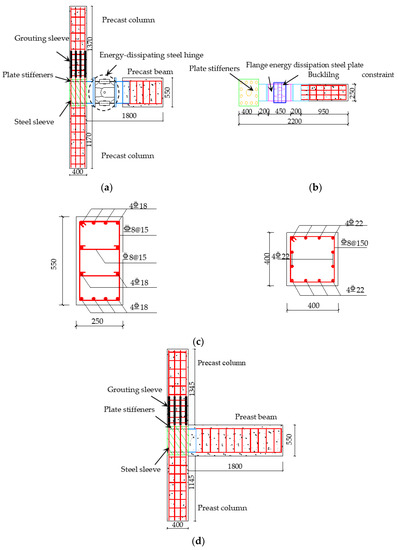 Two tested specimens, including one precast replaceable beam-to-column joint with an energy-dissipating steel hinge (J-R-1) and one steel sleeve confined concrete joint (J-2) were designed. It should be noted that the specimen J-R-1 was repaired after the first test by replacing the damaged member in steel hinge and the repaired specimen (J-R-2) was tested again to verify the post-earthquake resilience. The geometric dimensions, configurations of the precast columns, and joint core area were the same for tested specimens, while the energy-dissipating steel hinges were installed at the predetermined plastic hinge region for J-R-1 and J-R-2. The structural configurations, geometric dimensions of each specimen, and the details of the energy-dissipating steel hinge and join core area are shown in Figure 2, Figure 3, Figure 4 and Figure 5.