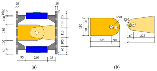 (a) Front view of the energy-dissipating steel hinge; (b) front view of the web mechanical hinge (unit: mm).