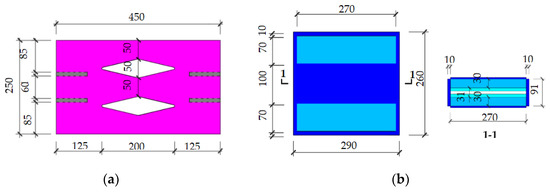 (a) The reduced energy-dissipation steel plate with diamond-shaped holes; (b) buckling constraint sleeve construction (unit: mm).
