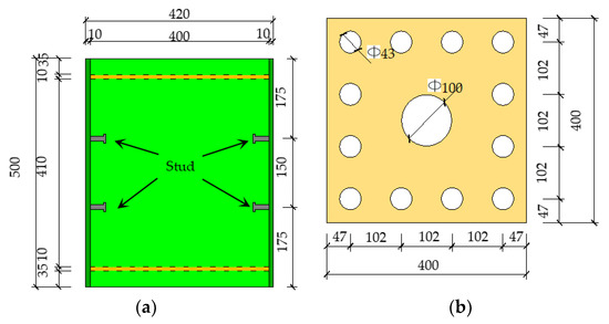 (a) Front view of the steel sleeve in the joint core area; (b) vertical view of the steel sleeve in the joint core area (unit: mm).