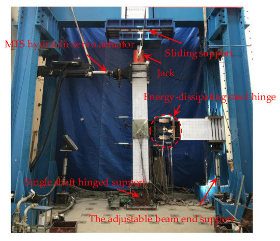 The test device is shown in Figure 6, including sliding support, jack, single-shaft hinged support, the adjustable beam-end support, the horizontal MTS hydraulic servo actuator, and the reaction wall. The MTS hydraulic servo actuator of 500 kN was connected to the reaction wall, and the other end was connected to the top of the upper column to apply horizontal cyclic reciprocating load. An axial load was applied to the top of the column with an axial compression ratio of 0.3. Loading was carried out by load–displacement control, where before yielding, the specimens were loaded with 0.25Pc, 0.5Pc, and 0.7Pc (Pc was the theoretic ultimate bearing capacity obtained from numerical simulation), and then displacement with the multiple increments of yield displacement (Δj) was applied after yielding and repeated three times. The test was stopped when the bearing capacity of the specimens decreased to 85% of the peak load or when the specimens were obviously damaged.