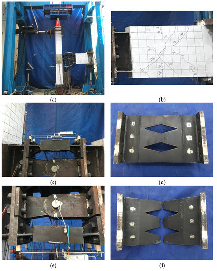 (a) Failure mode of the energy-dissipating hinge; (b) crack development in concrete; (c) failure mode of the upper connector; (d) failure mode of the upper steel plate; (e) failure mode of lower connector; (f) failure mode of the lower steel plate.