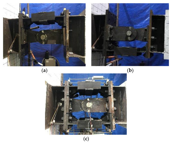 In this experiment, there was no crack development in the precast column and only slight cracks were observed in the precast beam. The overall of J-R-1 was concentrated in the energy-dissipating steel plate in the steel hinge. The damaged flange energy-dissipating steel plates were removed and new steel plates were reinstalled, while the other precast framing components were not replaced, to generate repaired specimen J-R-2. The repair process is illustrated in Figure 8, and the whole process only took about one hour with high efficiency and convenient operation.