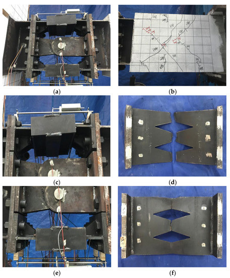The failure mode of the reduced energy-dissipating steel plate with diamond-shaped openings of specimen J-R-2 is shown in Figure 9c,e. It showed that there were also serious cracks at the weakened section of the flange-reduced energy-dissipating steel plate and the necking phenomenon was obvious. No out-of-plane buckling failure occurred in the specimen. In conclusion, the plastic damage accumulated in the reduced energy-dissipating steel plate of the specimen J-R-2, and was similar with specimen J-R-1.