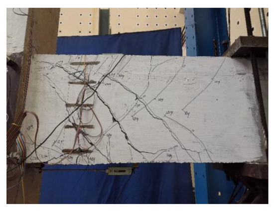 Compared with specimen J-R-1 and J-R-2, there were obvious shear cracks that developed in the side of the beam of specimen J-2 when loaded to 20 mm (displacement loading 2Δj). With loading increasing, the shear crack ran across the whole side of the beam at 40 mm (displacement loading 4Δj). The bearing capacity of specimen J-2 decreased when the displacement was approximately 60 mm (displacement loading 6Δj). The width of the shear crack on the beam side reached 1 cm when loading to 80 mm (displacement loading 8Δj). The bearing capacity gradually dropped and was reduced to less than 85% of the peak load. At this time, the test was terminated, and Figure 10 demonstrates the failure mode of specimen J-2.