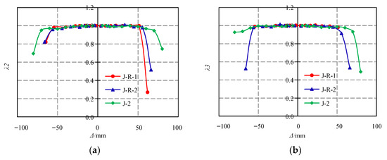 The strength degradation curves of each specimen are presented in Figure 13, while λ2 and λ3 are the strength degradation coefficients of the second and third cycles at the same loading level. Before the peak load, the strength degradation coefficient of each specimen was kept at about 1.0, indicating a relatively stable strength development. The strength degradation of specimens J-R-1 and J-R-2 occurred at the loading displacement of 6Δj, while almost no strength degradation was found before 6Δj. The reduced energy-dissipating steel plate with diamond-shaped openings was damaged at the reduced section, and the strength degradation curve decreased significantly. However, the strength of specimen J-2 degraded at an earlier stage.